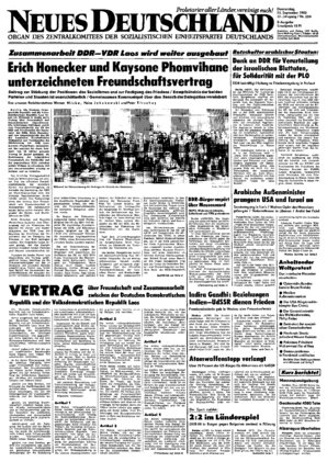 Berlin. Die Deutsche Demokratische Republik und die Volksdemokratische Republik Laos haben am Mittwoch in Berlin einen Vertrat über Freundschaft und Zusammenarbeit abgeschlossen. Das bedeutsame Dokument wurde vom Generalsekretär des ZK der SED und Vorsitzenden des Staatsrates der DDR, Erich Honecker, und vom Generalsekretär des ZK der Laotischen Revolutionären Volkspartei und Vorsitzenden des Ministerrates der VDR Laos, Kaysone Phomvihane, unterzeichnet ...