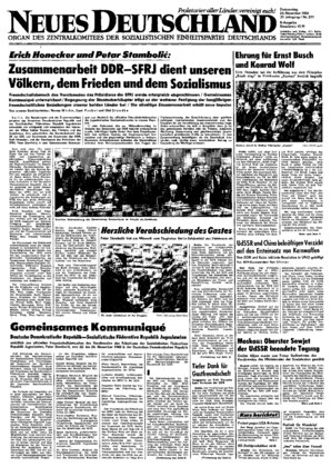 Berlin. Der Vorsitzende des Präsidiums der Sozialistischen Föderativen Republik Jugoslawien, Petar Stambolie, hat am Mittwochvormittag seinen offiziellen dreitägigen Freundschaftsbesuch in der DDR beendet und die Heimreise angetreten. Auf dem Flughafen Berlin-Schönefeld wurden er und diie ihn begleitenden Persönlichkeiten vom Generalsekretär des ZK der SED und Vorsitzenden des Staatsrates der DDR", Erich Honecker, und weiteren Mitgliedern der Partei- und Staatsführung herzlich verabschiedet ...