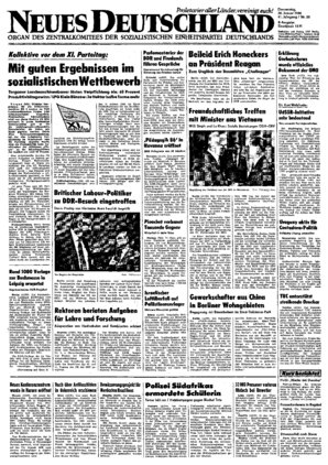 BerUn (ADN). Der Minister für Auswärtige Angelegenheiten der DDR, Oskar Fischer, empfing am Mittwoch die Teilnehmer der Beratung stellvertretender Minister für Auswärtige Angelegenheiten der Mitgliedsstaaten des Warschauer Vertrages. Das Gespräch fand in einer offenen und freundschaftlichen Atmosphäre statt ...