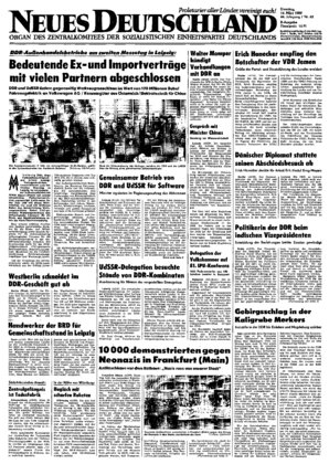 Frankfurt (Main) (ADN). Einen Tag nach den hessischen Kommunalwahlen protestierten in Frankfurt (Main) rund 10 000 Bürger der Stadt gegen den Einzug von Neonazis in das Staütparlament. Gewerkschafter, Sozial<Jömokraten, Kommunisten, Christen, Grüne und zahlreiche ausländische Einwohner folgten einem ...