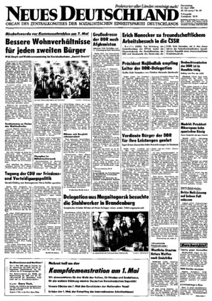 Werter Genosse Dr. Najibullah! Anläßlich des-11. Jahrestages der April-Revolution übermittle ich Ihnen, dem Zentralkomitee der Demokratischen Volkspartei Afghanistans und dem afghaniischen Volk die herzlichsten Glückwünsche des Zentralkomitees der Sozialistischen Einheitspartei Deutschlands, des Staatsrates und des Volkes der Deutschen Demo» kratischen Republik ...
